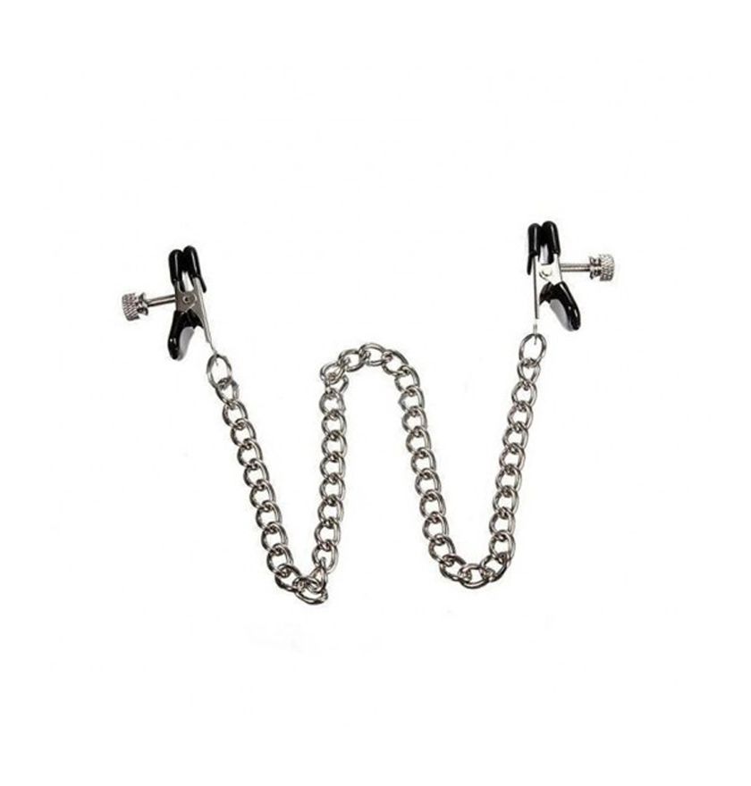 O formato do grampo é de presilha ajustável. Por ser forrado com borracha, seu conforto e comodidade são essenciais para proporcionar muito mais prazer. O prendedor de mamilos possui botões de ajustes e corrente de metal interligando-os.